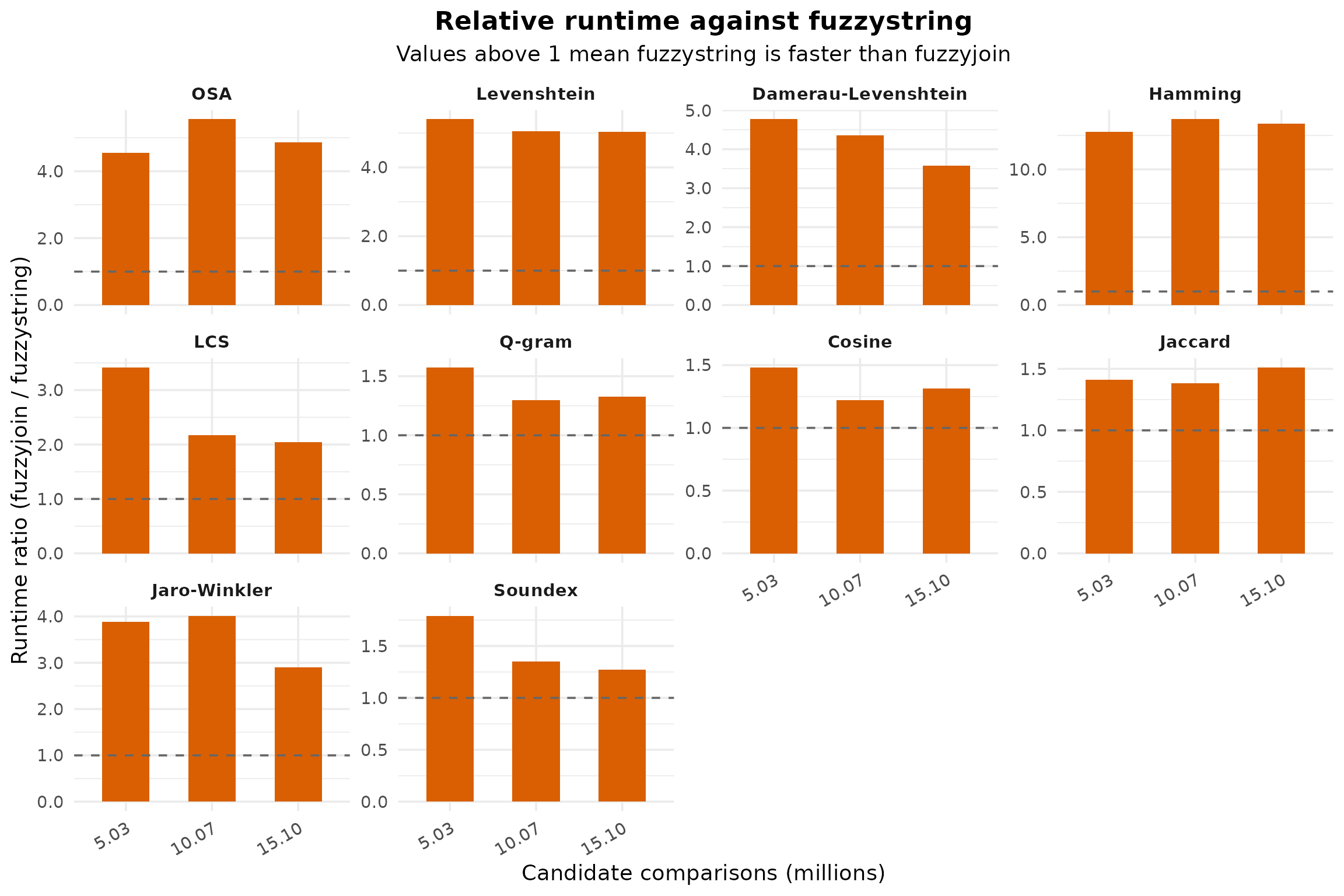 Values above 1 indicate that fuzzystring is faster than fuzzyjoin for the same method and workload size.
